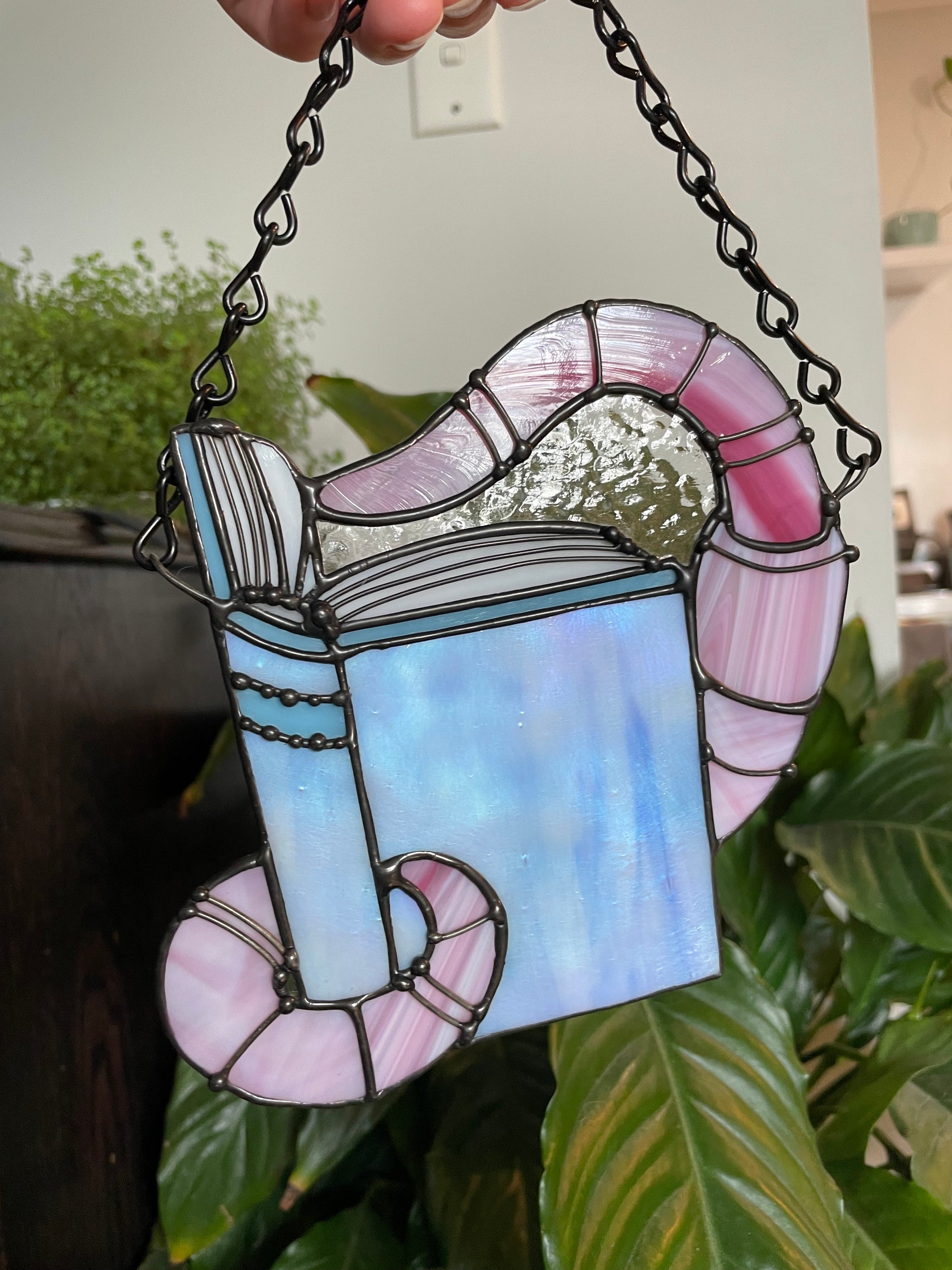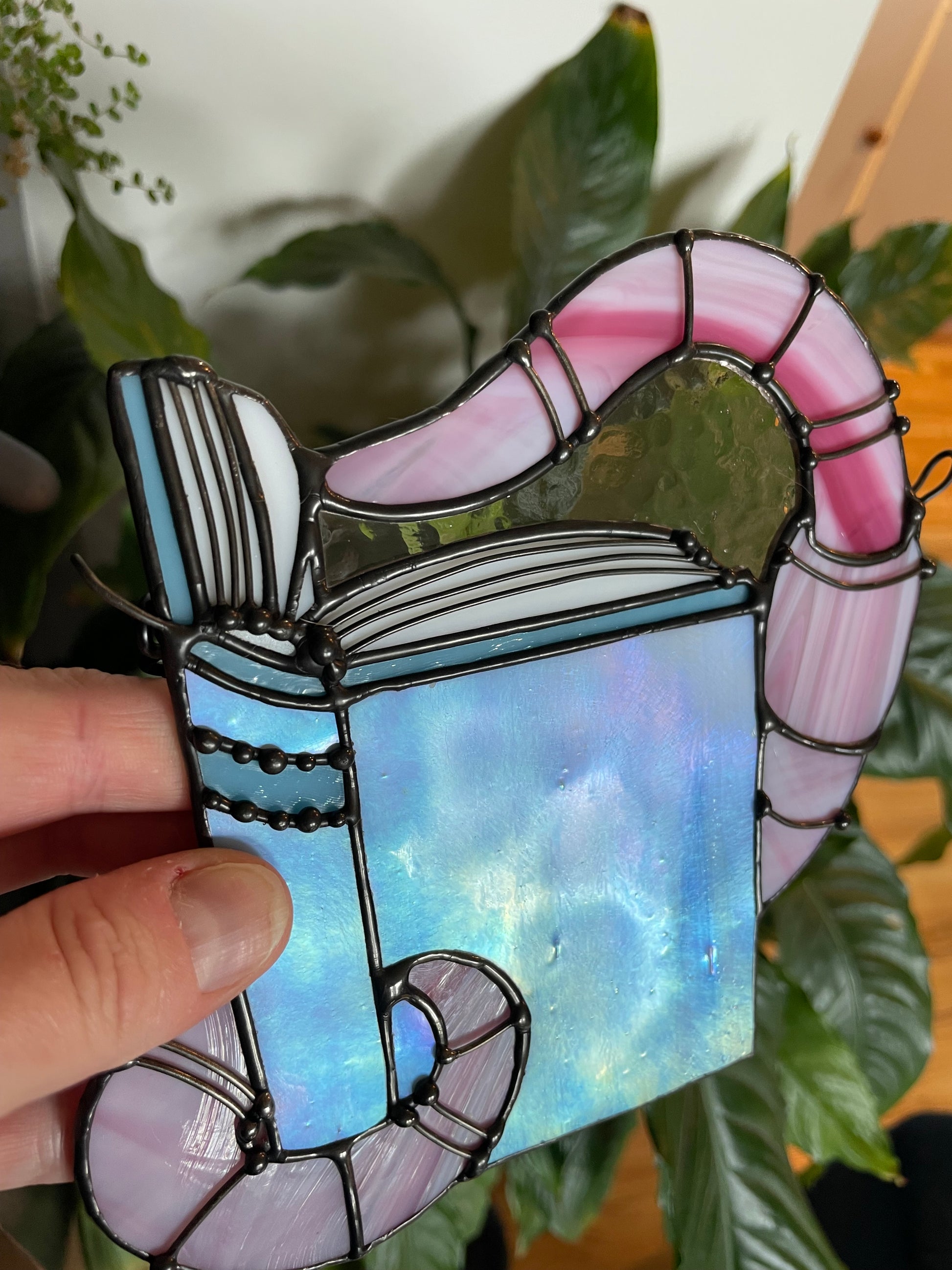 This piece issues some beautiful discontinued pink spectrum glass and an iridised blue mottle.